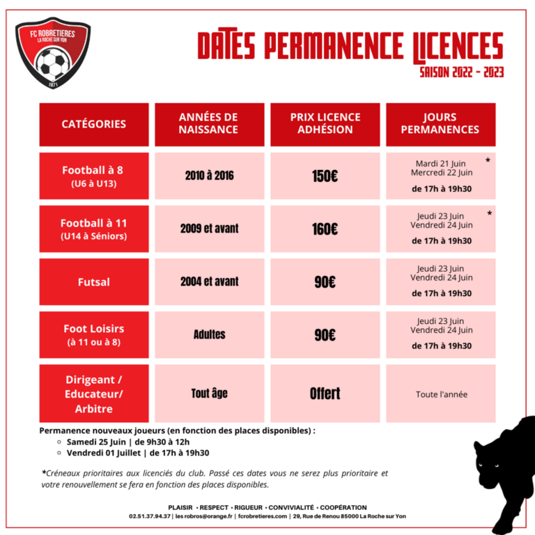 Télécharger le document pdfDossier pour les licences 2022/2023 à nous rapporter complet avec le règlement aux dates de permanence prévues (sur le dossier)